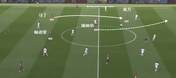 关键点还是因为有了佩德里,通过后者拖后,一来保证传球和推进的稳定性,二来也能做好攻防转换时的选位,这样一来,贝尔纳尔利用自己阅读比赛和洞察空间的能力适时前插,可以起到不错的效果。