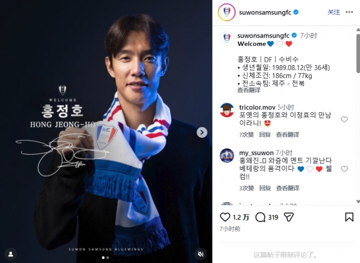1月7日讯 K联赛球队水原三星官方宣布,36岁前韩国国脚洪正好自由身加盟球队。